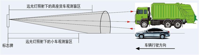 傳統(tǒng)交通標志是通過反光膜的逆反射(reflective)功能來實現(xiàn)交通語言信息被動反光,然而,反光膜的逆反射功能是存在一定的局限性,在《城市道路交通標志和標線設(shè)置規(guī)范》(GB51038)等 多部標準中,明確提出,“位于行車道上方標志版面的逆反射性能,宜比路側(cè)標志提高一個等級”、“通行大型車位為主的道路宜采用V類大廣角反光膜”,這是由于普通標志在遠光燈照射下,由于光的衍射性能,在反射時會形成光錐,并形成核心亮,外圍暗的特征,如下圖,這就是為什么大角度下標志反光不清;高座貨車的觀察視角下,看到的交通標志很大一部分是不反光的原因。而主動發(fā)光標志,由于光的漫反射現(xiàn)象,在不通的角度都能清晰視認標志信息。