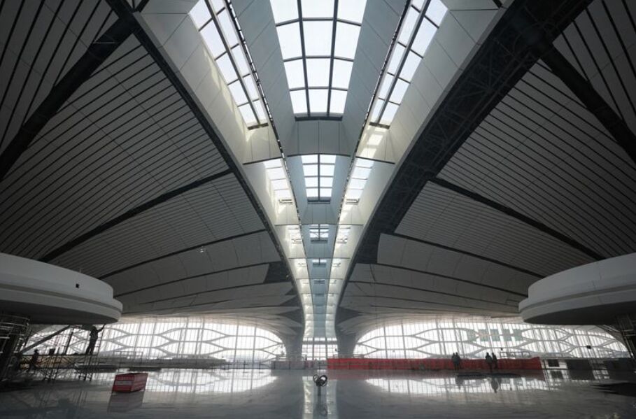 俯瞰北京大興國際機場,就像一只展翅欲飛的鳳凰,咖啡黃的外體,頭尾對稱,四翅展開,一副雄越宇宙的姿態(tài),主要主要由航站區(qū)、飛行區(qū)、綜合交通中心等部分組成。屋頂采用了鋼網(wǎng)架結構,由63450根桿件和12300個球節(jié)點拼裝而成,從空中看,形成了一個不規(guī)則的自由曲面空間。