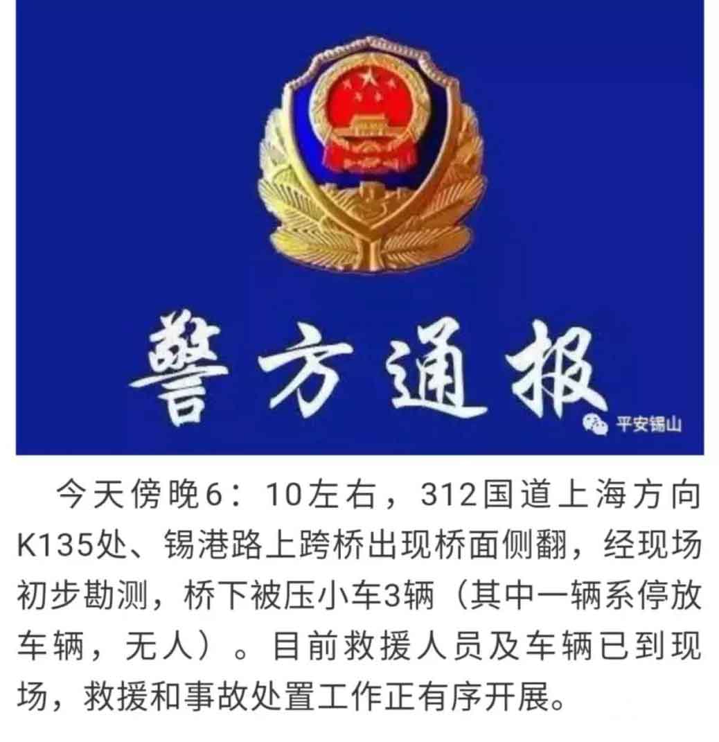 記者從無錫市錫山區(qū)警方獲悉,10月10日下午6:10左右,312國道上海方向K135處、錫港路上跨橋出現(xiàn)橋面?zhèn)确鹿剩?jīng)現(xiàn)場初步勘察,橋下被壓小車3輛(其中一輛系停放車輛,無人)。目前救援人員及車輛已到現(xiàn)場,救援和事故處置工作正有序開展。