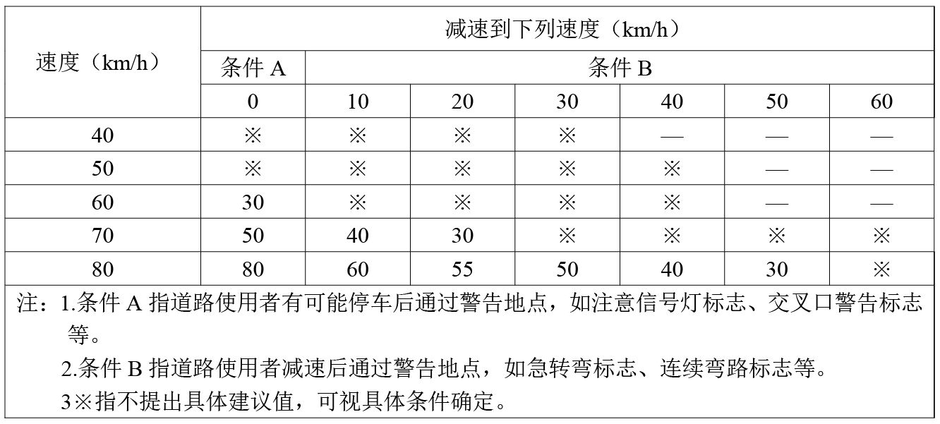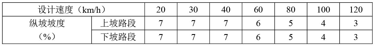 2、當(dāng)縱坡坡度值大于下表規(guī)定值時(shí),應(yīng)當(dāng)設(shè)置“上/下陡坡標(biāo)志”;當(dāng)縱坡坡度值小于下表規(guī)定值時(shí),對于經(jīng)常發(fā)生制動失效事故的下坡路段,也可根據(jù)現(xiàn)場條件設(shè)置“下陡坡標(biāo)志”。