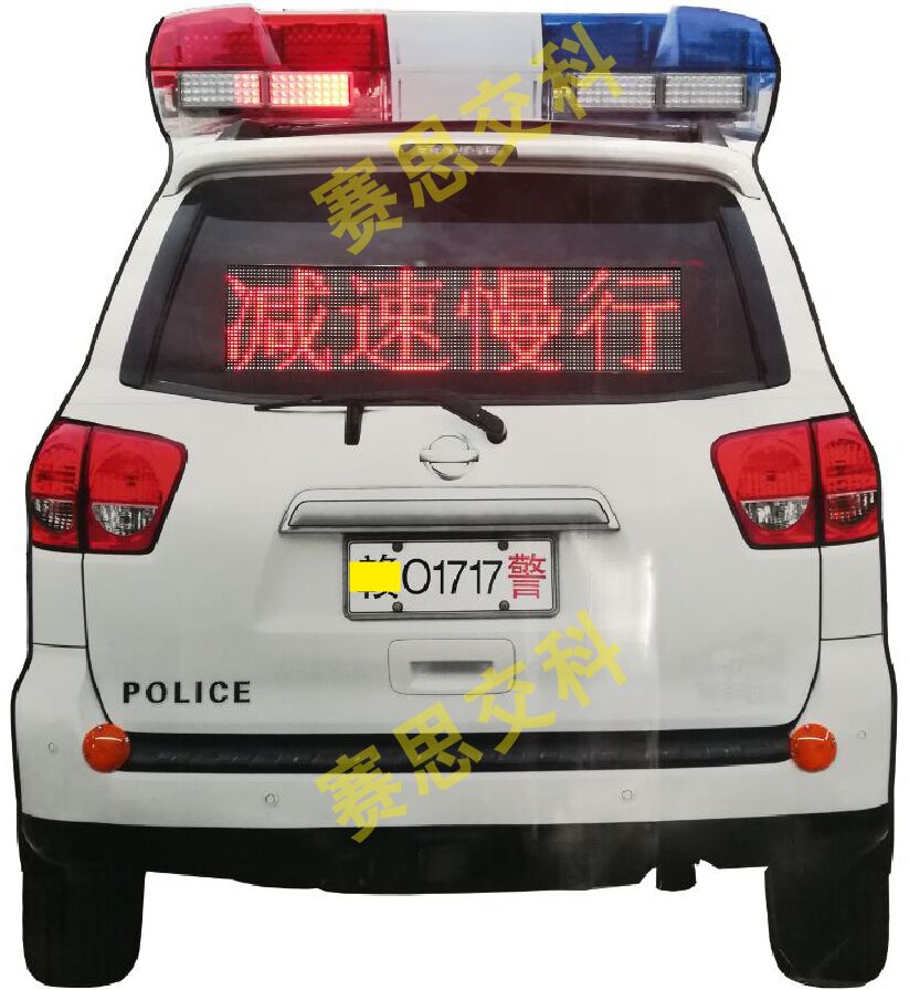 2、基本說(shuō)明:標(biāo)志面層為仿真等比例警車車尾UV噴繪圖案,面層采用鋁質(zhì)板材,標(biāo)志圖案、字樣輪廓嵌入紅色高倍LED發(fā)光管,上置紅、藍(lán)暴閃燈,下方左右各置全紅剎車燈,中間“車窗”設(shè)置發(fā)光警示標(biāo)語(yǔ),整體結(jié)構(gòu)合理,用材精致。