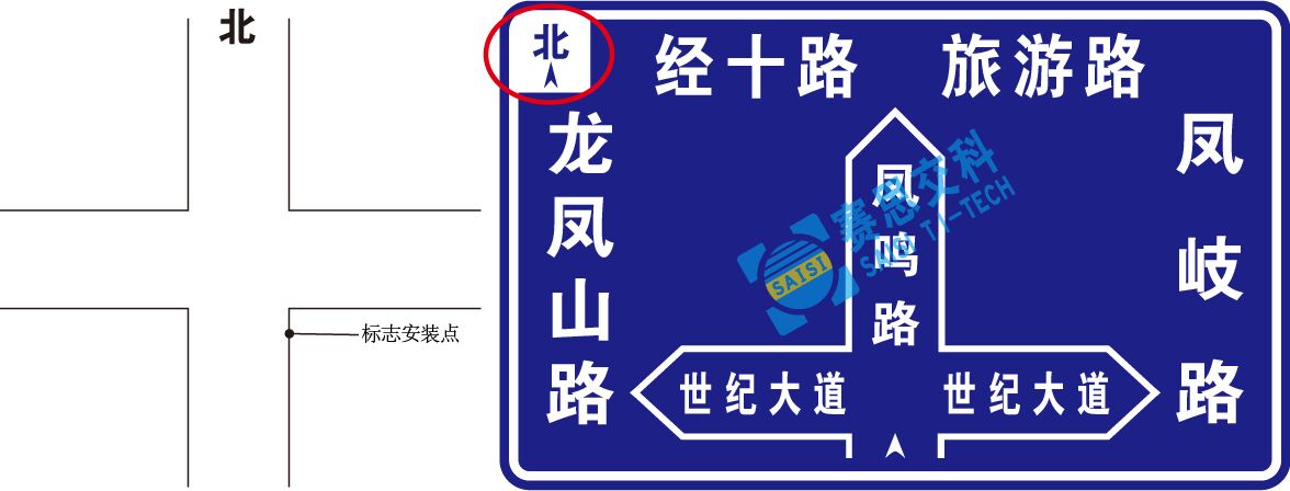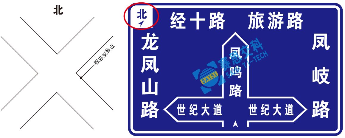 2、當(dāng)標(biāo)志設(shè)置在行駛方向右側(cè)時可在其版面左上角標(biāo)識地理方向信息;