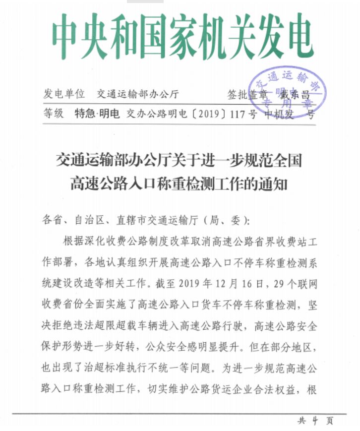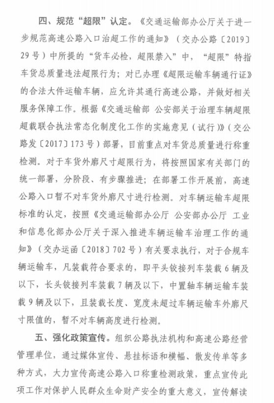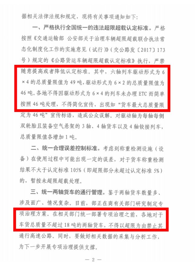 為進(jìn)一步相應(yīng)國家關(guān)于收費(fèi)公路制度改革取消高速公路省界收費(fèi)站工作部署,近日,交通運(yùn)輸部發(fā)文《交通運(yùn)輸部辦公廳為進(jìn)一步規(guī)范全國高速公路入口稱重檢測工作的通知》(以下簡稱“通知”),該通知重點(diǎn)強(qiáng)調(diào)了全國統(tǒng)一的違法超限超載認(rèn)定執(zhí)行標(biāo)準(zhǔn),并進(jìn)一步明確“六軸列車驅(qū)動(dòng)形式為6*4的總質(zhì)量限值為49噸,驅(qū)動(dòng)形式為6*2的總質(zhì)量限值為46噸。各地不得因驅(qū)動(dòng)形式為6*4的列車未辦理ETC而簡單按照46噸處理,不得簡化宣傳,出現(xiàn)如“貨車最大總質(zhì)量限定為46噸”宣傳標(biāo)語,造成公眾誤解?!?;同時(shí)還要求,各地對于車貨總重不超過18噸的兩軸貨車,不得以超限為由禁止其通行高速公路。