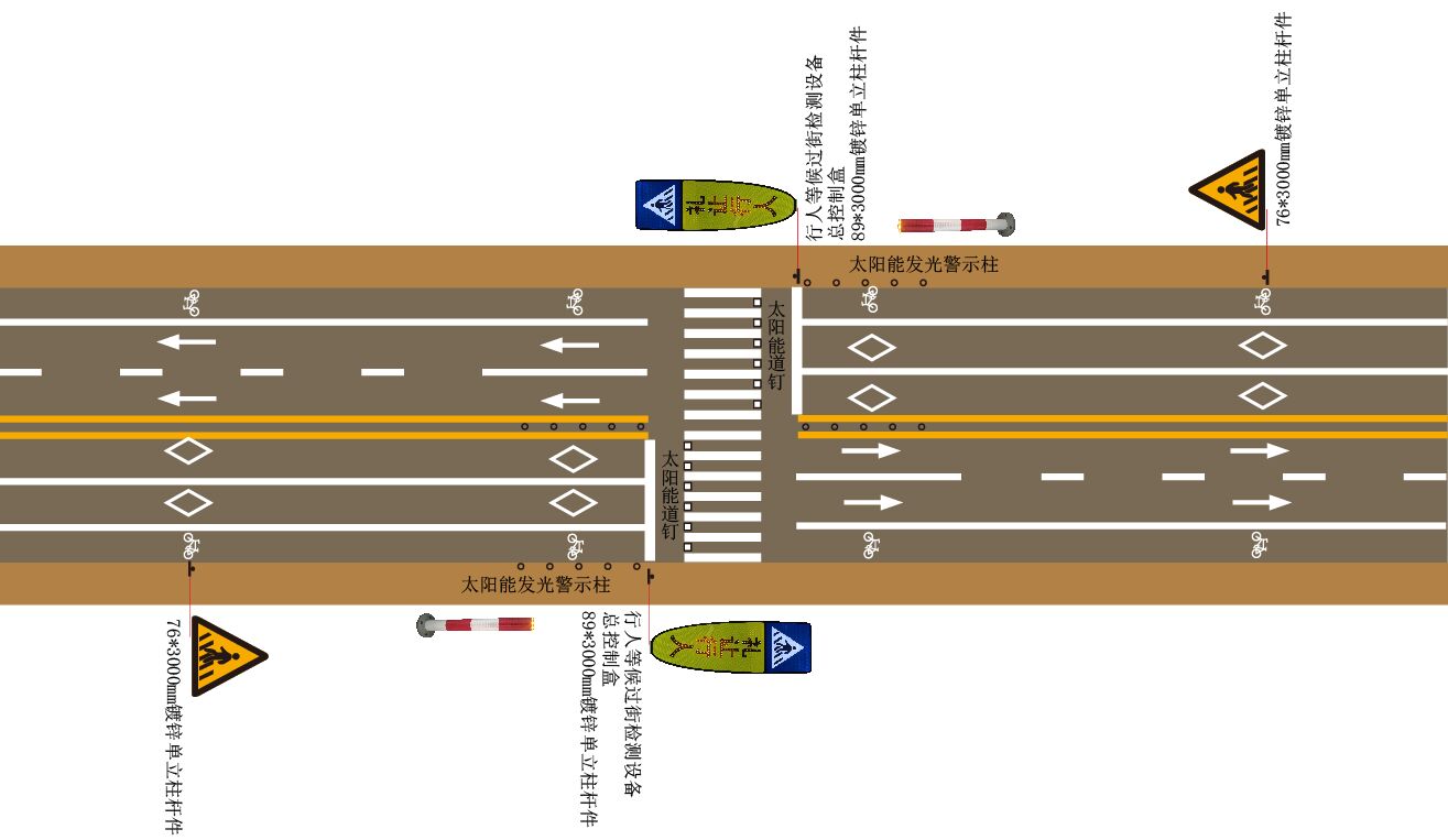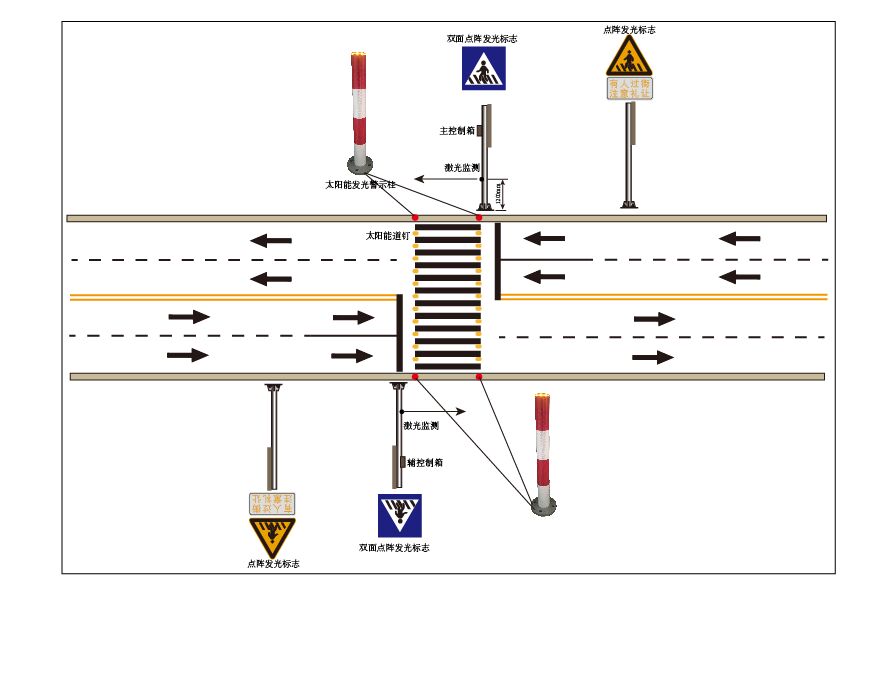 本解決方案所涉安全設施包括:主動發(fā)光注意行人標志、太陽能發(fā)光警示柱、太陽能道釘、主動發(fā)光“禮讓行人”標志、行人過街檢測感應設備、數(shù)據(jù)傳輸接受設備等。