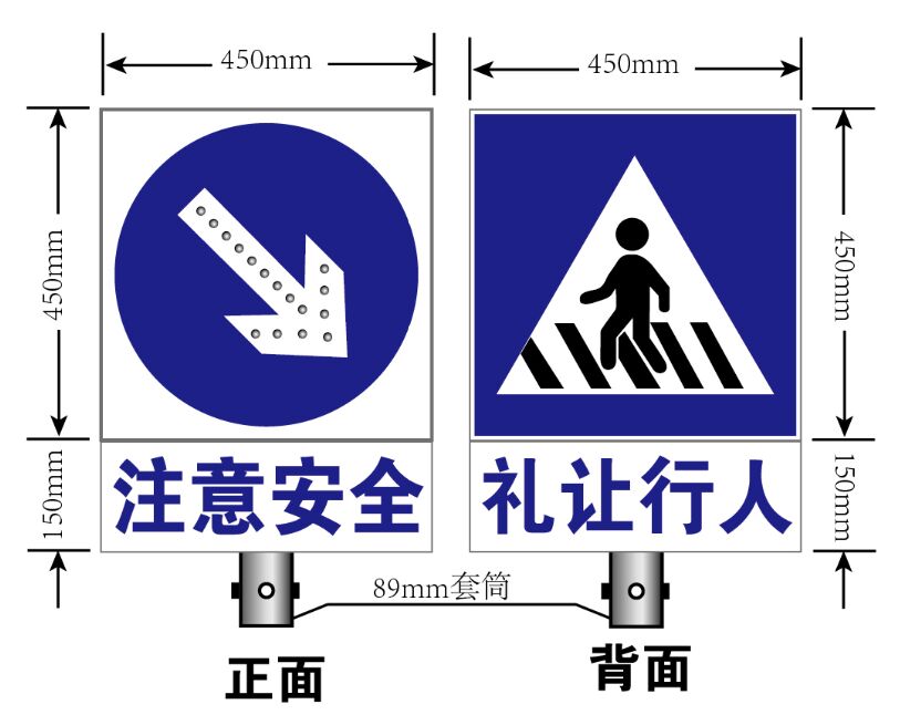 在交通安全工程中,為了讓某區(qū)域根據(jù)不同的車(chē)流方向設(shè)置不同的路權(quán),需要在入口顯眼處設(shè)定雙面標(biāo)志牌,方便不同方向的車(chē)流觀察、確認(rèn),如中央隔離帶缺口處,設(shè)置雙面太陽(yáng)能標(biāo)志牌,一面為“允許掉頭”,另一面為“禁止掉頭”,用于區(qū)分來(lái)、去車(chē)輛的掉頭權(quán)利。當(dāng)然,也存在這樣的雙面太陽(yáng)能標(biāo)志牌,正面為主標(biāo)志信息版面,背面為“謹(jǐn)慎駕駛、注意安全”等交通安全宣傳標(biāo)語(yǔ)。