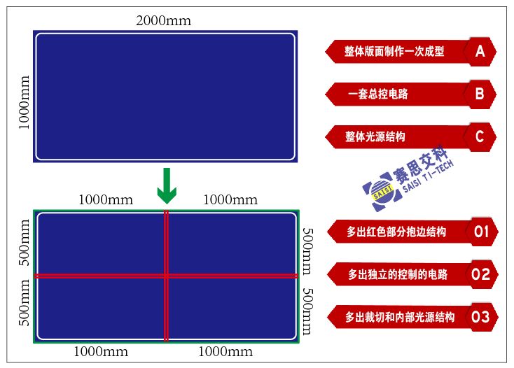 單塊標(biāo)志的報(bào)價(jià),不同的版面尺寸、版面內(nèi)容,對(duì)標(biāo)志的報(bào)價(jià)也會(huì)有一點(diǎn)的影響。1、版面尺寸。(1)版面尺寸在:1平米至15平米之間,按正常平方單價(jià)報(bào)價(jià)(**元/平米);(2)版面尺寸大于15平米時(shí),因大版面需要加內(nèi)部特殊加固結(jié)構(gòu),故其平方單價(jià)要比正常尺寸略高;通常會(huì)加50元/平米;(3)尺寸小于1平米時(shí),小型標(biāo)志需要多追加抱邊結(jié)構(gòu)、控制電路、人工損耗等(如下圖:1塊1米*2米的標(biāo)志,和4塊0.5米*1米相比較,雖面積相等,但造價(jià)成本卻有差異,顯然用同樣的平方單價(jià)計(jì)算就不合理。),故其通常按單套報(bào)價(jià)(**元/套),若折算為平方單價(jià),通常會(huì)乘以1.2—1.3的系數(shù)。
