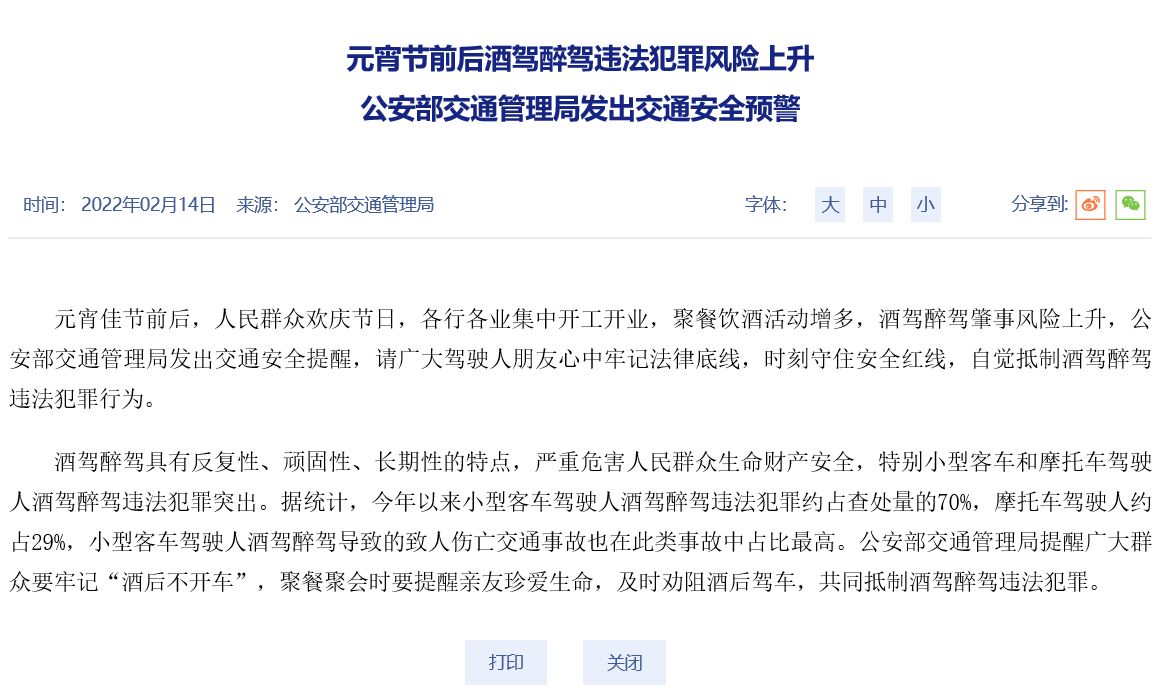 明天就是元宵節(jié),春節(jié)年假最長(zhǎng)的企業(yè)單位、個(gè)體工商戶(hù),也將陸續(xù)開(kāi)工開(kāi)業(yè),出現(xiàn)扎堆的聚餐團(tuán)聚活動(dòng),按以往經(jīng)驗(yàn),元宵節(jié)前后,酒駕醉駕等肇事風(fēng)險(xiǎn)明顯上升。為此,公安部交通管理局于2022年2月14日,特別發(fā)文《元宵節(jié)前后酒駕醉駕違法犯罪風(fēng)險(xiǎn)上升,公安部交通管理局發(fā)出交通安全預(yù)警》,旨在提醒廣大駕駛?cè)伺笥研闹欣斡浄傻拙€(xiàn),時(shí)刻守住安全紅線(xiàn),自覺(jué)抵制酒駕醉駕違法犯罪行為。