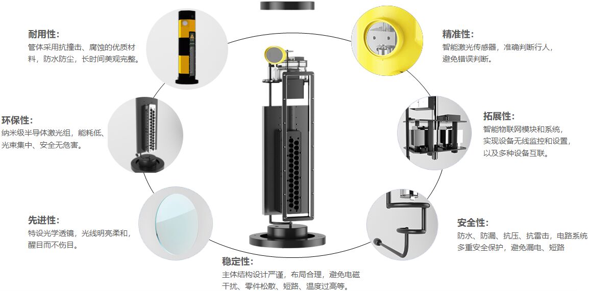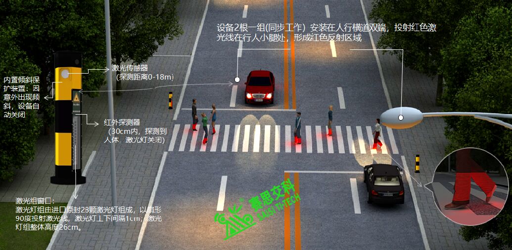?????? 為服務(wù)道路交通事故預(yù)防"減量控大"核心工作,為一線公安交管部門提供科技支撐和實用方案,南京賽思交通信息科技有限公司推出了人行橫道激光智能樁,旨在解決城市支干線道路、車道較多或中間有安全島的道路、城市郊區(qū)道路、國省道與沿線支小路交叉口中人行斑馬線的夜晚交通安全問題。全新的智能解決方案平衡了道路機動車的通行效率和斑馬線下的行人安全,將助力解決城市道路安全隱患“痛點”,填補市場空缺。目前方案已獲得國家發(fā)明專利,通過公安部交通安全產(chǎn)品檢測中心檢測認證,是市場上唯一具備知識產(chǎn)權(quán)和權(quán)威部門認證的相關(guān)產(chǎn)品和方案。