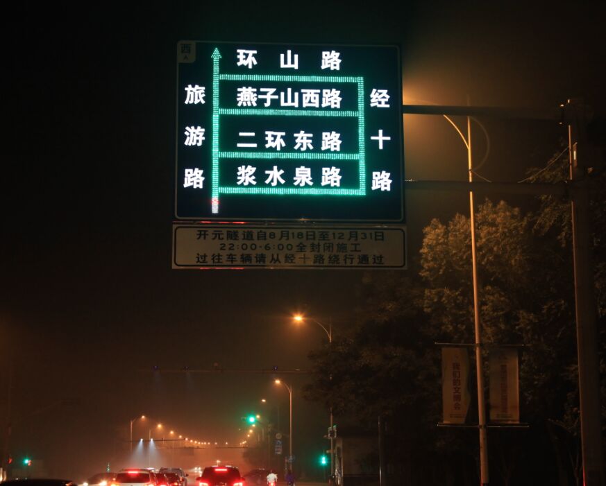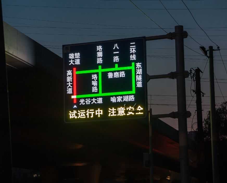 2、標(biāo)志版面整體采用主動(dòng)發(fā)光技術(shù),路網(wǎng)部分嵌入三基色LED光帶誘導(dǎo)屏體。