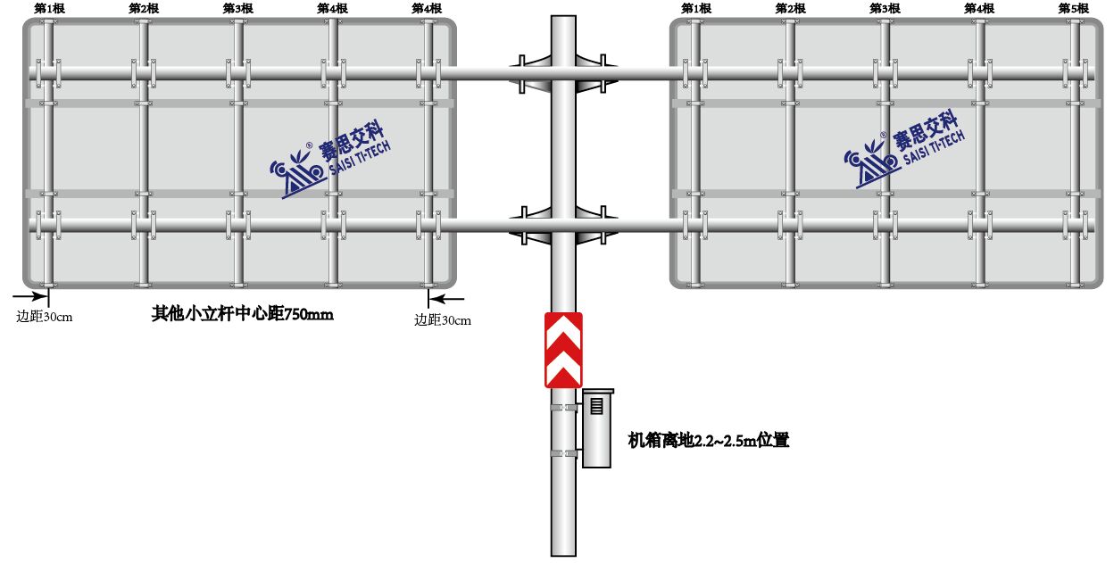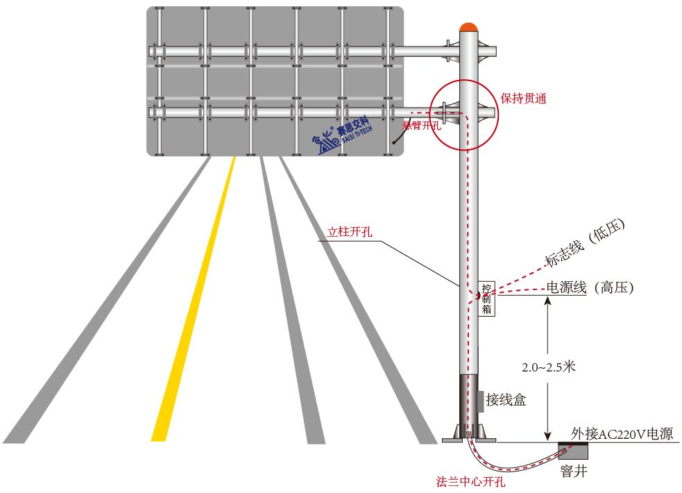(3)安裝控制機箱。首先正確選擇待安裝標志所對應(yīng)的機箱,不同標志對應(yīng)不同機箱(因機箱最大承受負載不同,在機箱上貼有對應(yīng)標志版面),不得隨意混雜機箱使用。新建桿件應(yīng)按下圖所示開孔,讓管線在桿件內(nèi)部;控制箱安裝于路外一側(cè),離低高度約為2.2~2.5米,此高度,單人無法夠著;若有故障需檢修時,人字梯也方便檢修。