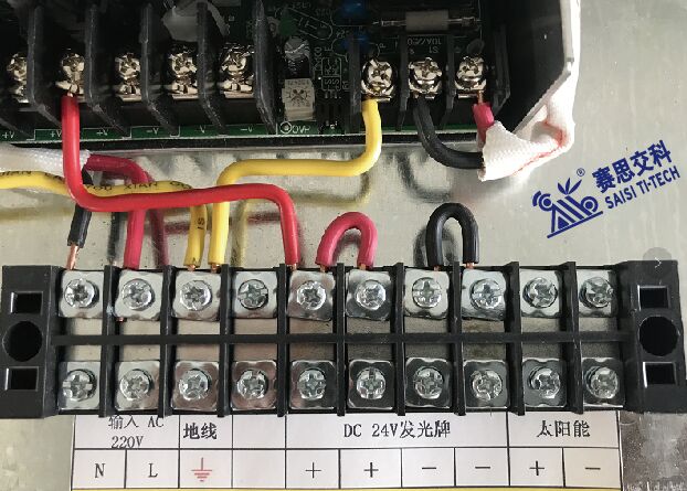 (4)控制線接電。本操作必須為持證的專業(yè)電工??!標志牌背面出1根2芯電纜線,內(nèi)部工作電壓為DC24V,注意區(qū)分電線的正負極(具體供貨隨附的《安裝說明書》會詳細列明),將這兩根線接入"DC發(fā)光標志牌"所示接線端子上,嚴謹接入旁邊的高壓區(qū)?。?/strong>接線板如下圖所示。將“空開”按鍵下拉至“關(guān)閉”狀態(tài) ,再將市電接線接入左側(cè),輸入AC220V的接線端子,在開啟電源前,先檢查以下接線,確保準確無誤后,方可開啟電源。注:控制系統(tǒng)為自動光控(白天不亮,夜晚自動開啟),白天安裝時,需測試,可用黑色物蓋在控制箱的光敏端子上,模擬夜晚效果。