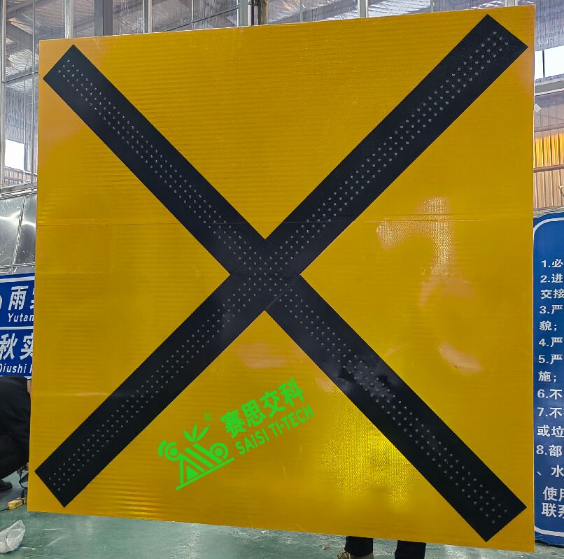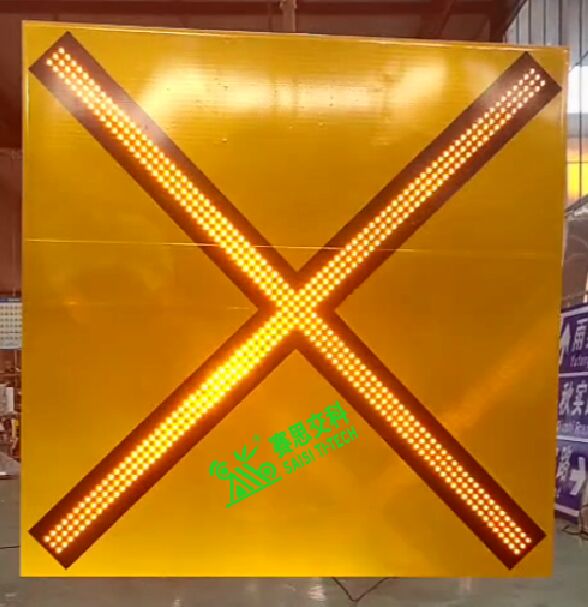 發(fā)光禁航標(biāo)志的整體形狀為方型,版面為黃色底膜,黑色叉形圖案,通常采用2000mm*2000mm,或2400mm*2400mm尺寸;主要設(shè)置于橋孔上方,表示該橋孔僅為對向航道通航方向,本方向為禁航方向,不得通行。根據(jù)國標(biāo)《中國海區(qū)可航行水域橋梁助航標(biāo)志》(GB 24418)的技術(shù)要求,版面圖標(biāo)如下: