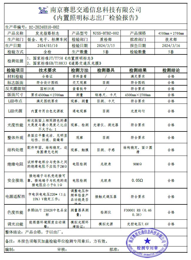 (10)文件材料檢查。最后,我們在發(fā)光標(biāo)志產(chǎn)品批量打包,準(zhǔn)備發(fā)貨前,還需檢查所供貨品的文件資料是否齊備,主要包括:《出廠檢測報(bào)告》、《合格證書》、《安裝說明書》、《交貨清單表》、《公安部檢測報(bào)告》等,為方便客戶向業(yè)主交貨,提供必要的交貨資料。