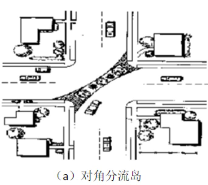 對角分流島是設(shè)置在交叉口對角線上的障礙物,以阻斷直行車流。其優(yōu)點是:不需要封閉街道,只需要改變現(xiàn)有街道的方向;能保證行人和自行車通行。缺點是:需要重新改造拐彎處的路緣,造價可能比較高;內(nèi)部和救援車有時需要繞行。