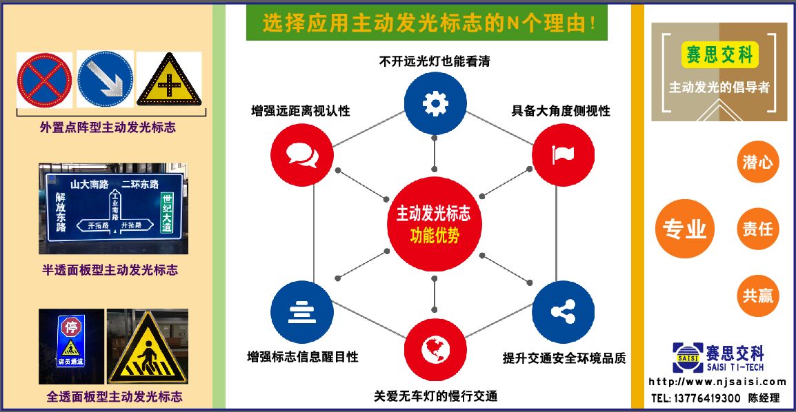 南京賽思交通信息科技有限公司,是一家專業(yè)從事交通安全研究、創(chuàng)新型交安設(shè)施研發(fā)的科技型公司,我公司研發(fā)、生產(chǎn)、銷售的主動發(fā)光標(biāo)志系列產(chǎn)品,已在全國各地的交通安全工程中廣泛使用,并在交通穩(wěn)靜化的提示、警示、管理方面取得了良好的功能效果,更多了解交通安全技術(shù)方案、創(chuàng)新交通安全產(chǎn)品,可登錄本網(wǎng)站www.leetrongas.com查閱,或致電:陳經(jīng)理,13776419300。
