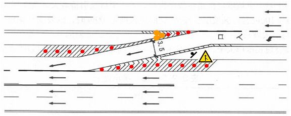 (2)除設(shè)置必要的出口指路標(biāo)志和限制速度標(biāo)志等外,應(yīng)在輔路左側(cè)連續(xù)設(shè)置兩個注意左側(cè)合流標(biāo)志,前后間距宜為100m。